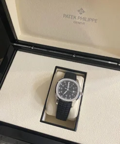 Patek Philippe reinterprets the quartz Aquanaut Luce in stainless steel with a larger diameter (38.8 mm) and a new integrated composite strap. This epitome of contemporary casual chic is attired in an elegant shade of black adorning the dial and matching strap. Water-resistant to 120m, the rounded octagonal case is enhanced by polished and satin finishes. The bezel is lit up by a row of 48 diamonds (~1.11 ct). The patented folding clasp is secured by four independent catches.