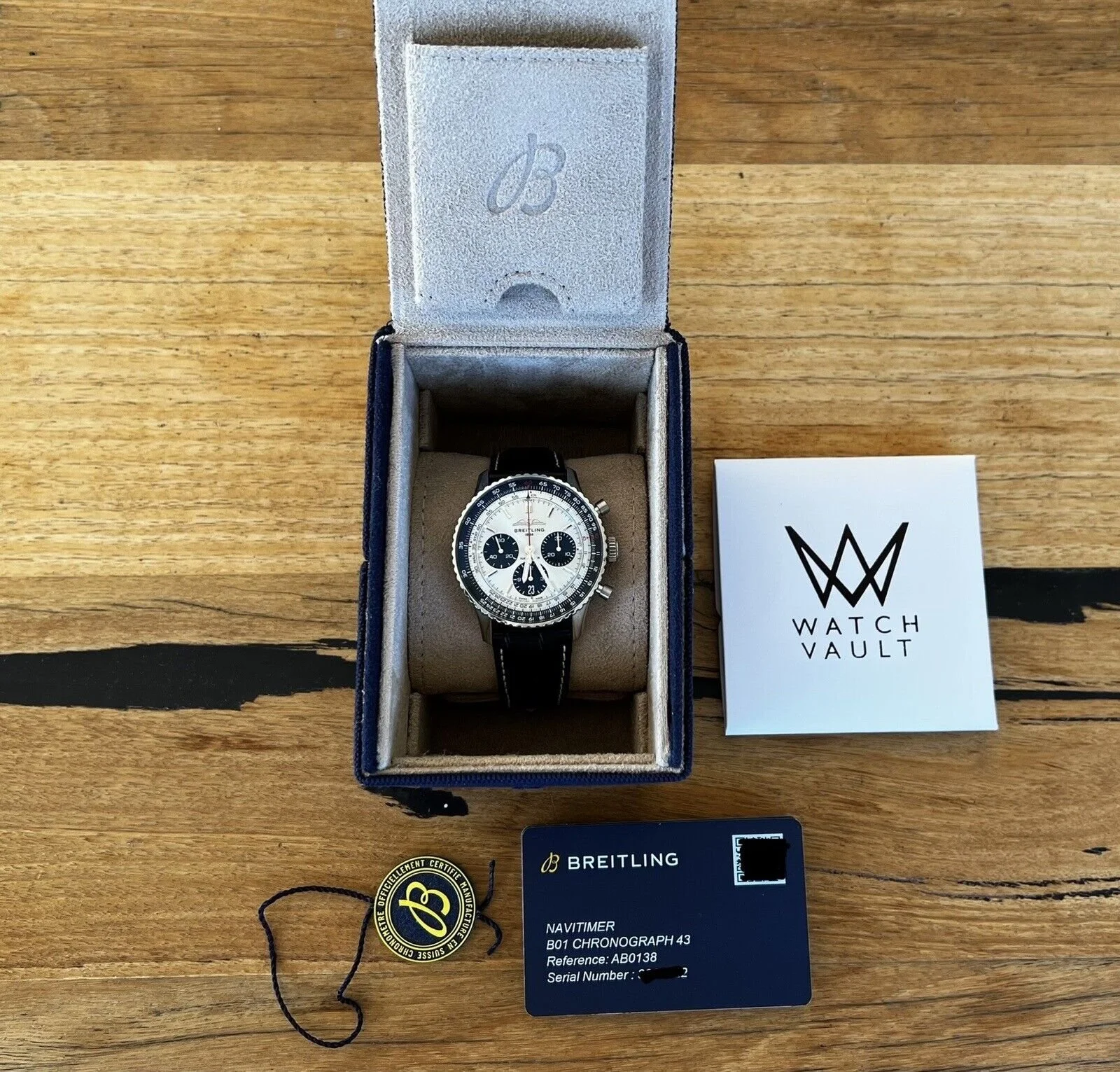The version we have here is the latest, called Navitimer B01 AB0138241, and is one of our favorites in the current range. Featuring a stunning ice blue dial with black sub-dials, the stunning B01 caliber, all housed in a more wear-resistant 43mm steel case.