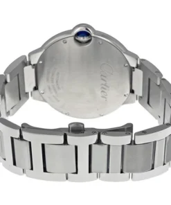 Stainless steel case with a stainless steel bracelet. Fixed stainless steel bezel. Silver-tone opal dial, blue sword-shaped hands and Roman numerals. Minute markers around inner ring.