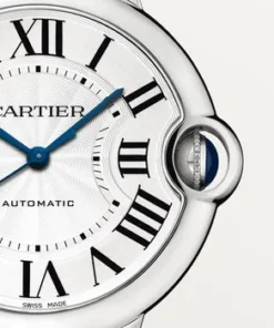 Ballon Bleu de Cartier watch, 40 mm, mechanical manufacture movement with automatic winding, caliber 1847 MC. Steel case, fluted crown set with a synthetic spinel cabochon, silvered guilloch?? dial, blued-steel sword-shaped hands??