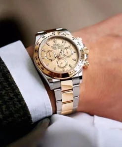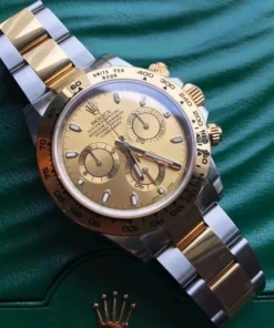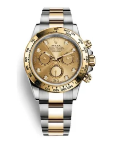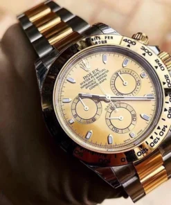 THIS OYSTER PERPETUAL COSMOGRAPH DAYTONA IN OYSTERSTEEL AND YELLOW GOLD, WITH A CHAMPAGNE-COLOUR DIAL AND AN OYSTER BRACELET, FEATURES A YELLOW GOLD BEZEL WITH ENGRAVED TACHYMETRIC SCALE.