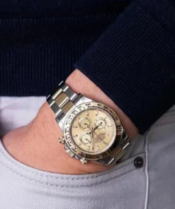 THIS OYSTER PERPETUAL COSMOGRAPH DAYTONA IN OYSTERSTEEL AND YELLOW GOLD, WITH A CHAMPAGNE-COLOUR DIAL AND AN OYSTER BRACELET, FEATURES A YELLOW GOLD BEZEL WITH ENGRAVED TACHYMETRIC SCALE.