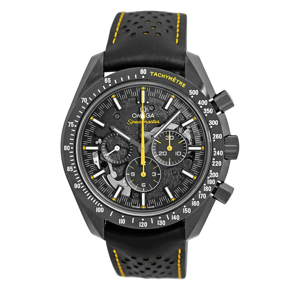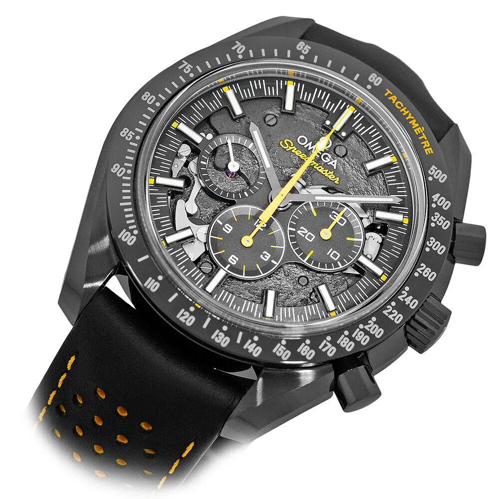 In this 44.25 mm model, the Speedmaster??s lunar history is celebrated on the blackened movement, which has been laser-ablated to represent the moon??s surface. The near side can be seen through the blackened skeletonised dial, while the far side can be seen through the caseback.
