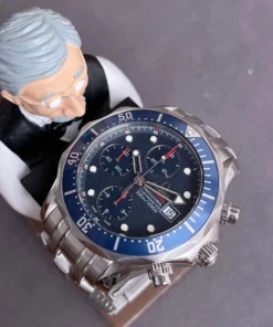 This OMEGA Seamaster Diver 300M features a blue dial decorated with a wave pattern. There is a date window at the 3 o??clock position, 30-minute and 12-hour recorders and a small seconds dial. The distinctive dial is visible through a scratch-resistant sapphire crystal. The blue unidirectional rotating bezel is mounted on a 41.5 mm stainless steel case with a helium-escape valve at 10 o’clock.