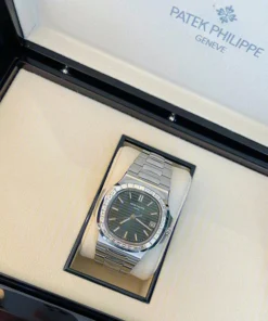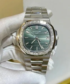 This Patek Philippe Nautilus features a distinctive shape of the octagonal bezel with its softened angles accentuated by a row of 32 internally flawless Top Wesselton baguette-cut diamonds (~3.6 cts).