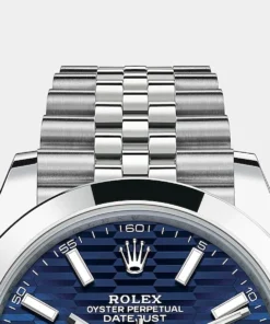 THIS OYSTER PERPETUAL DATEJUST 41 IN OYSTERSTEEL FEATURES A BRIGHT BLUE, FLUTED-MOTIF DIAL AND A JUBILEE BRACELET.