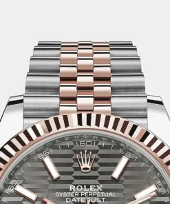THIS OYSTER PERPETUAL DATEJUST 41 IN OYSTERSTEEL AND EVEROSE GOLD FEATURES A SLATE, FLUTED-MOTIF DIAL AND A JUBILEE BRACELET.