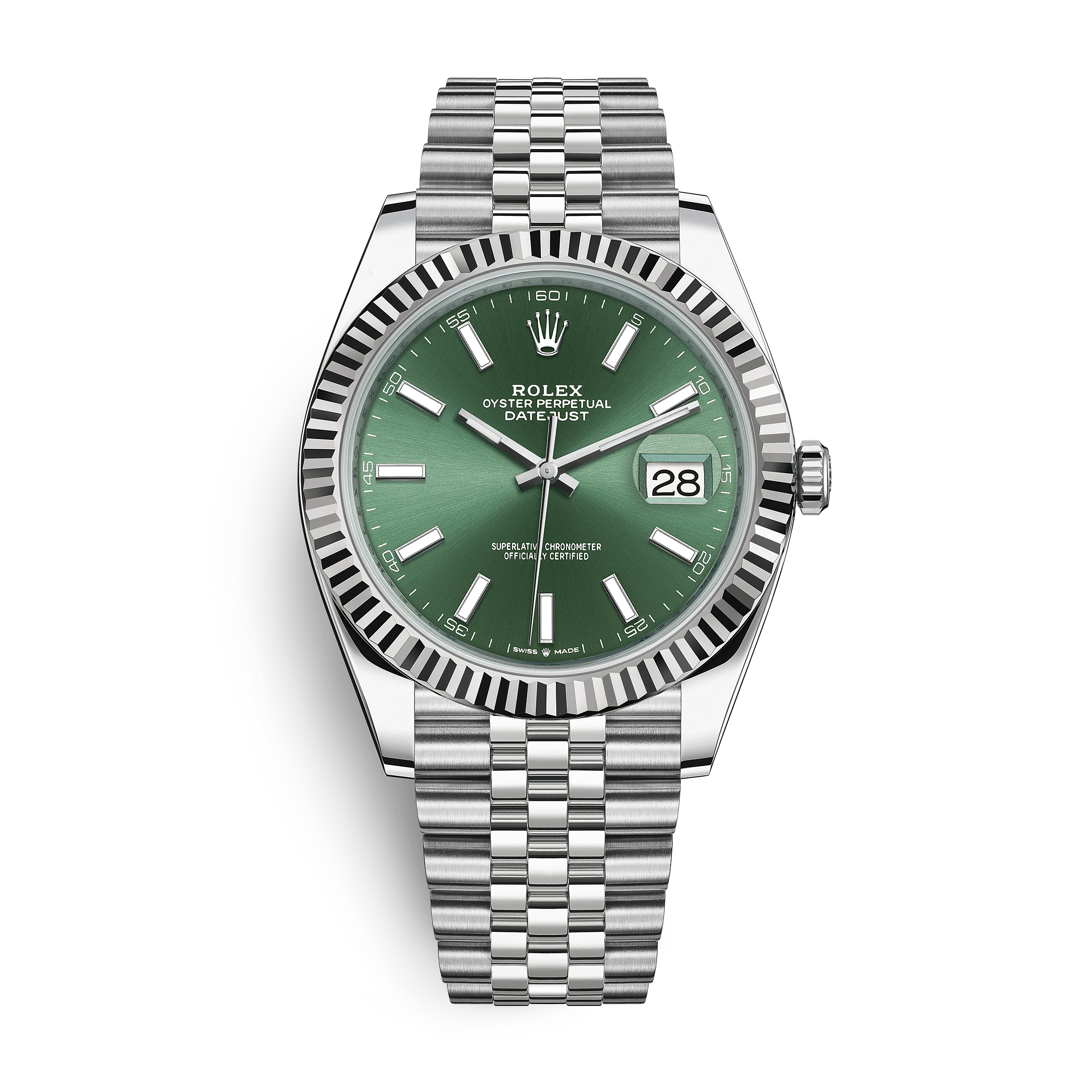 THIS OYSTER PERPETUAL DATEJUST 41 IN OYSTERSTEEL AND WHITE GOLD FEATURES A MINT GREEN DIAL AND A JUBILEE BRACELET.
