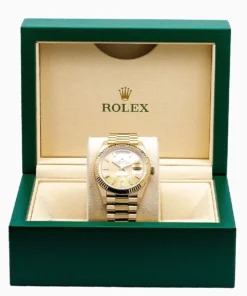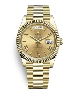 The Rolex fluted bezel is a mark of distinction. Originally, the fluting of the Oyster bezel had a functional purpose: it served to screw the bezel onto the case helping to ensure the waterproofness of the watch. It was therefore identical to the fluting on the case back, which was also screwed onto the case for waterproofness, using specific Rolex tools. Over time, the fluting became an aesthetic element, a genuine Rolex signature feature. Today the fluted bezel is a mark of distinction,?in gold on this Day-Date 40.