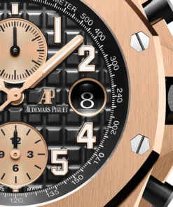 Black dial engraved with “M??ga Tapisserie” oversized check decoration, with rose gold sub-dials, rose gold applied hour-markers and Royal Oak hands with luminescent coating, black inner bezel.