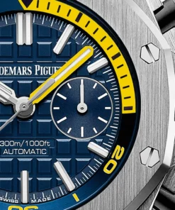 A blue Royal Oak Offshore with a splash of yellow, boasting fresh design and fun features. Dive into fun with the new Royal Oak Offshore Diver Chronographs, characterized by daring new design elements. Blackened white gold hands and hour-markers stand out against bright, high-contrast and funky colors.