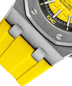 A summery bright yellow Oak Offshore. Blatant, refreshing, funky. Featuring the selfwinding Manufacture caliber 3124/3841 with a power reserve of 50 hours, 59 jewels and 21,600 vibrations/hour fitted into a 42 mm stainless steel case with sapphire crystal open caseback.
