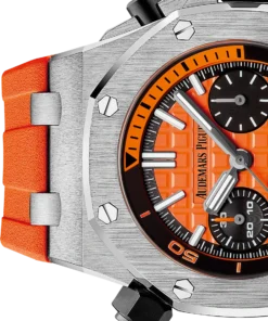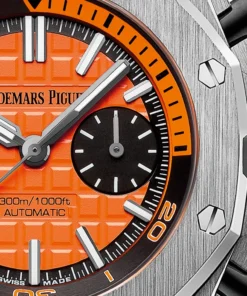 Orange dial with ??M??ga Tapisserie?? pattern, black counters, blackened gold applied hour-markers and Royal Oak hands with luminescent coating, black rotating inner bezel with diving scale and zone from 60 to 15 minutes in orange.