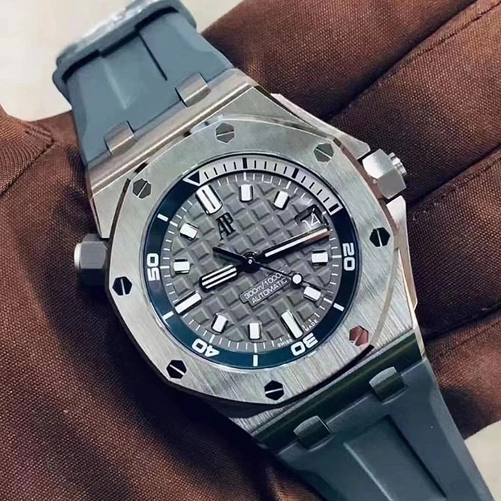 Grey dial with ??M??ga Tapisserie?? pattern, white gold applied hour-markers and Royal?Oak hands with luminescent coating, blue rotating inner bezel with zone from 60 to 15 minutes in white