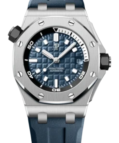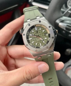 Army green dial with “M??ga Tapisserie” engraved oversized check, rose gold luminescent applied hour-markers and Royal Oak hands, black rotating inner bezel with beige 0 to 15 minutes zone