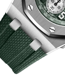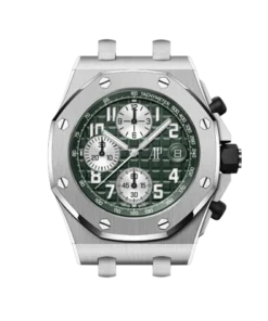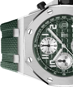 Khaki green dial with ??Mega Tapisserie?? pattern, silver-toned counters, arabic numerals hour-markers and white gold Royal?Oak hands with luminescent coating, khaki green inner bezel.