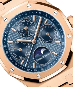 The blue shades of the Royal Oak Perpetual Calendar??s dial provide a powerful contrast with the 18-carat pink gold case and bracelet. The subdials and inner bezel adorn the iconic ??Night Blue, Cloud 50?? hue of the original Royal Oak.