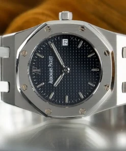 Blue dial with ??Grande Tapisserie?? pattern, white gold applied hour-markers and Royal Oak hands with luminescent coating.