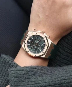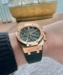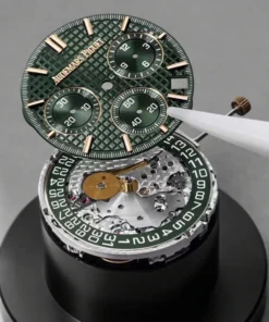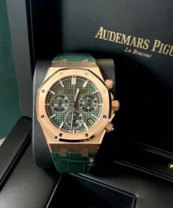 Khaki green dial with ??Grande Tapisserie?? pattern, green counters, pink gold applied hour-markers and Royal?Oak hands with luminescent coating.