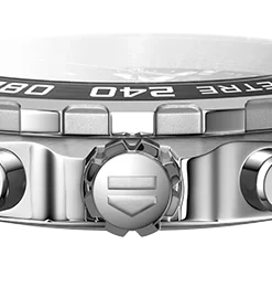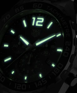 Solid steel 43mm case, fitted bracelet and specially decorated case-back, fine brushed and polished to a luxury gleam, and built to withstand the full pressures of professional racing.