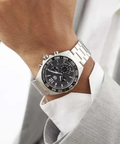 The steel bracelet has a double safety folding clasp to prevent accidental opening and a ??Driver?? extension for wearing over a racing suit.