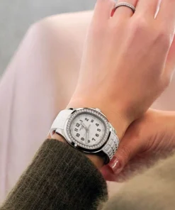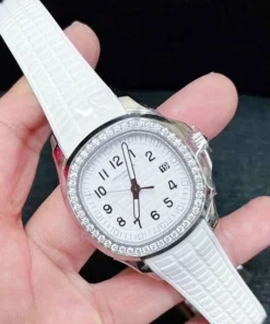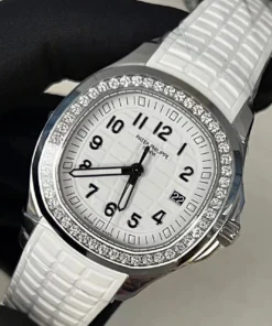 Patek Philippe reinterprets the quartz Aquanaut Luce in stainless steel with a larger diameter (38.8 mm) and a new integrated composite strap. This epitome of contemporary casual chic is attired in an elegant matte white color adorning the dial and matching strap. Water-resistant to 120m, the rounded octagonal case is enhanced by polished and satin finishes. The bezel is lit up by a row of 48 diamonds (~1.11 ct). The patented folding clasp is secured by four independent catches.