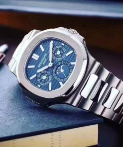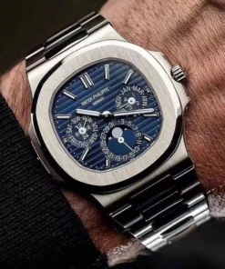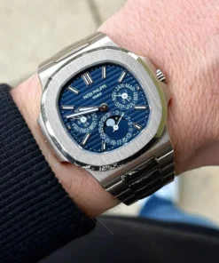 The first Grand Complication in the Nautilus collection, the Reference 5740/1 Nautilus perpetual calendar, offers a distinctive blend of sports appeal and technical sophistication. Thanks to the famous ultra-thin self-winding caliber 240 Q movement, the case (water resistant to 60 m) is remarkably svelte, making this watch Patek Philippe??s thinnest perpetual calendar. The bracelet is equipped with a new fold-over clasp providing optimized security.