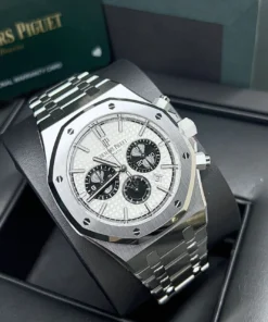 The powerful aesthetics of the Royal Oak??s signature stainless steel case, octagonal bezel and integrated bracelet, matched with a very contemporary two-tone dial, with silvered ??Grande Tapisserie?? pattern and expanded black chronograph counters at 9 o??clock and 3 o??clock.