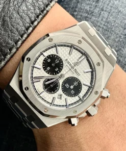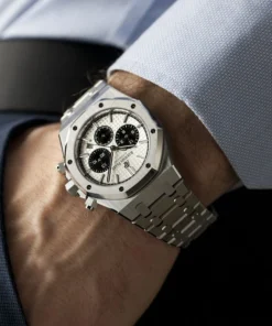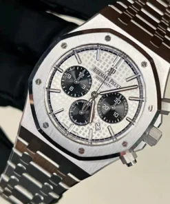 The powerful aesthetics of the Royal Oak??s signature stainless steel case, octagonal bezel and integrated bracelet, matched with a very contemporary two-tone dial, with silvered ??Grande Tapisserie?? pattern and expanded black chronograph counters at 9 o??clock and 3 o??clock.