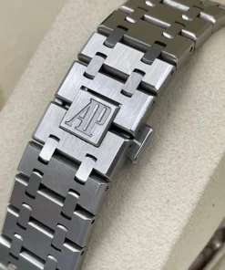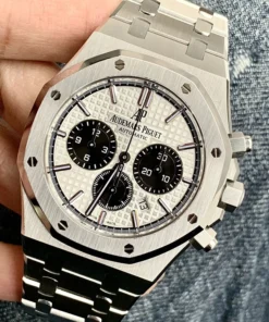 Silver-toned dial with ??Grande Tapisserie?? pattern, black counters and extern zone, white gold applied hour-markers and Royal Oak hands with luminescent coating.