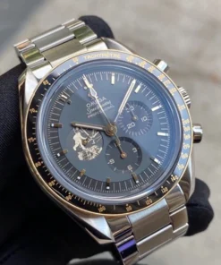 The watch includes a 42 mm case in stainless steel with a polished 18K Moonshine? Gold bezel. The bezel ring is polished black ceramic [ZrO2] with an OMEGA Ceragold? tachymeter scale. There is a varnished grey and black dial with all indexes and hands in 18K Moonshine? Gold – except the central chronograph seconds hand, which is PVD-coated in Moonshine Gold. A unique hour marker is positioned at 11 o’clock, and there is a distinctive 9 o’clock subdial in 18K Moonshine? Gold with a laser-engraved image of Buzz Aldrin climbing down onto the lunar surface.