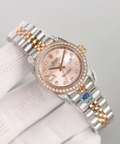 The Oyster case is matched with a diamond-encrusted bezel, and the sides of the case and lugs reflect an elegant luster, making the outline of the 28 mm Oyster case more prominent and more attractive.?As a Rolex classic ladies’ watch, the ladies’ timepiece is the continuation and sublimation of the brand’s classic timepiece, and has always been synonymous with elegant style and precise timepieces.