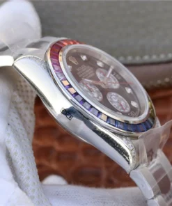 Daytona Swiss replica watches looks and function identical to a genuine Rolex. Our Swiss cloned Rolex chronograph movements feature every Rolex engraving, serial numbering and are lubed with Nano-oil Swiss lubricants and are designed to last a lifetime. Visually and functionally our chronograph movement 28.000 vibrations per hour offers the same fine sweep seconds hand ??Rolex?? motion as on the genuine Rolex. Our chronograph sub dials displays the seconds, minutes, hours and both screws down buttons are fully functional for the chronograph start-pause-stop functions.