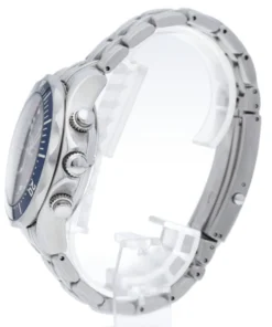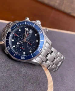 This OMEGA Seamaster Diver 300M features a blue dial decorated with a wave pattern. There is a date window at the 3 o??clock position, 30-minute and 12-hour recorders and a small seconds dial. The distinctive dial is visible through a scratch-resistant sapphire crystal. The blue unidirectional rotating bezel is mounted on a 41.5 mm stainless steel case with a helium-escape valve at 10 o’clock.