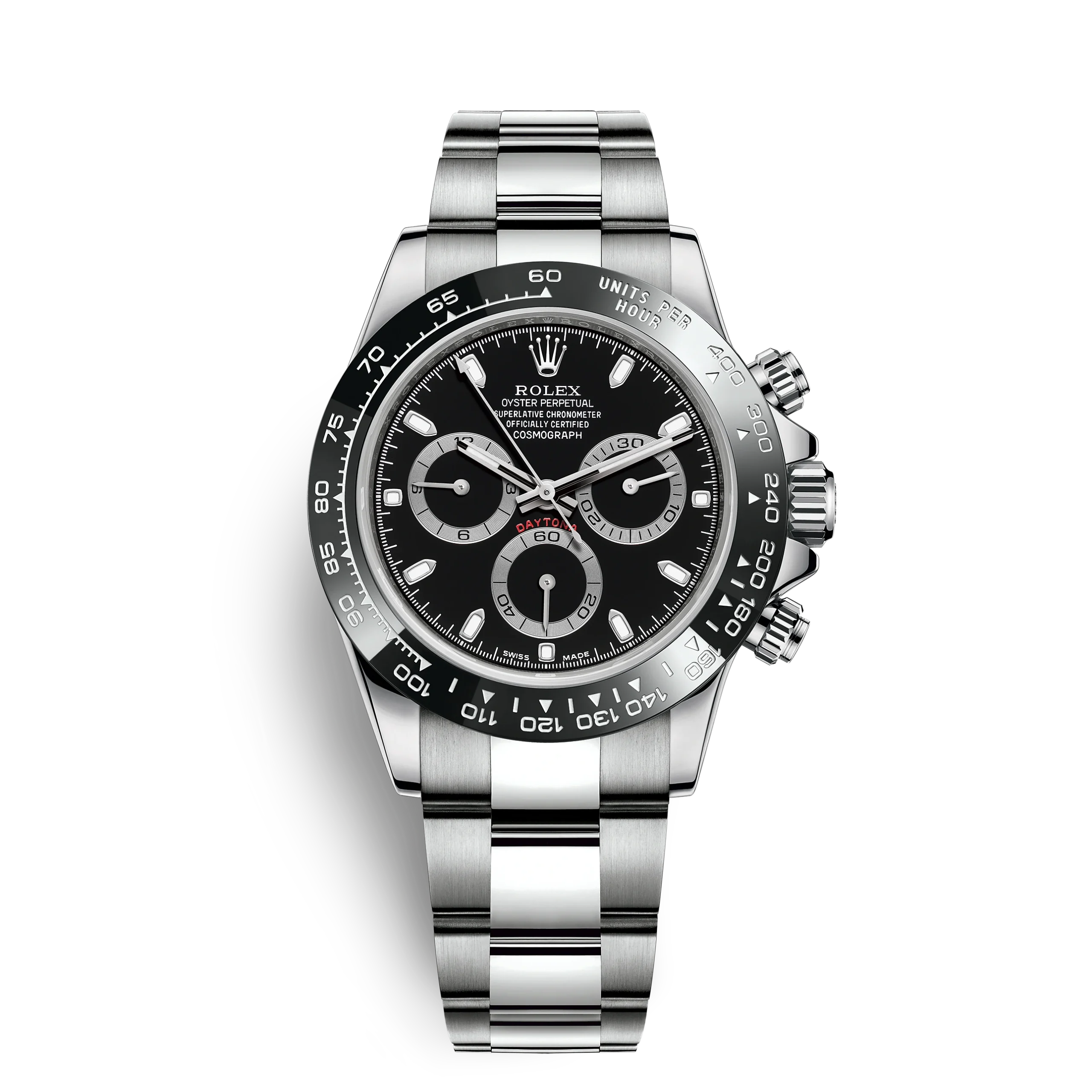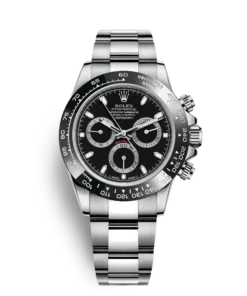 THIS OYSTER PERPETUAL COSMOGRAPH DAYTONA IN OYSTERSTEEL WITH A BLACK DIAL AND AN OYSTER BRACELET, FEATURES A BLACK CERACHROM BEZEL WITH TACHYMETRIC SCALE.