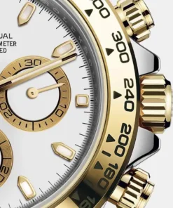 THIS OYSTER PERPETUAL COSMOGRAPH DAYTONA IN OYSTERSTEEL AND YELLOW GOLD, WITH A WHITE DIAL AND AN OYSTER BRACELET, FEATURES A YELLOW GOLD BEZEL WITH ENGRAVED TACHYMETRIC SCALE.