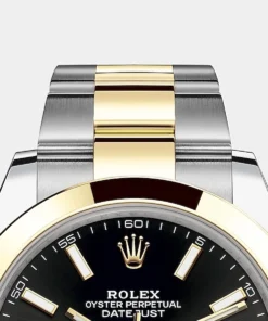 THIS OYSTER PERPETUAL DATEJUST 41 IN OYSTERSTEEL AND YELLOW GOLD FEATURES A BRIGHT BLACK DIAL AND AN OYSTER BRACELET.