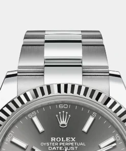 THIS OYSTER PERPETUAL DATEJUST 41 IN OYSTERSTEEL AND WHITE GOLD FEATURES A SLATE DIAL AND AN OYSTER BRACELET.