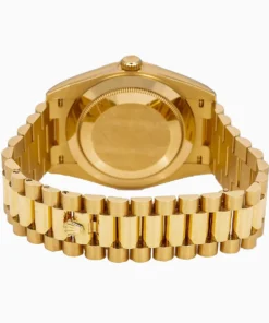 The Rolex fluted bezel is a mark of distinction. Originally, the fluting of the Oyster bezel had a functional purpose: it served to screw the bezel onto the case helping to ensure the waterproofness of the watch. It was therefore identical to the fluting on the case back, which was also screwed onto the case for waterproofness, using specific Rolex tools. Over time, the fluting became an aesthetic element, a genuine Rolex signature feature. Today the fluted bezel is a mark of distinction,?in gold on this Day-Date 40.
