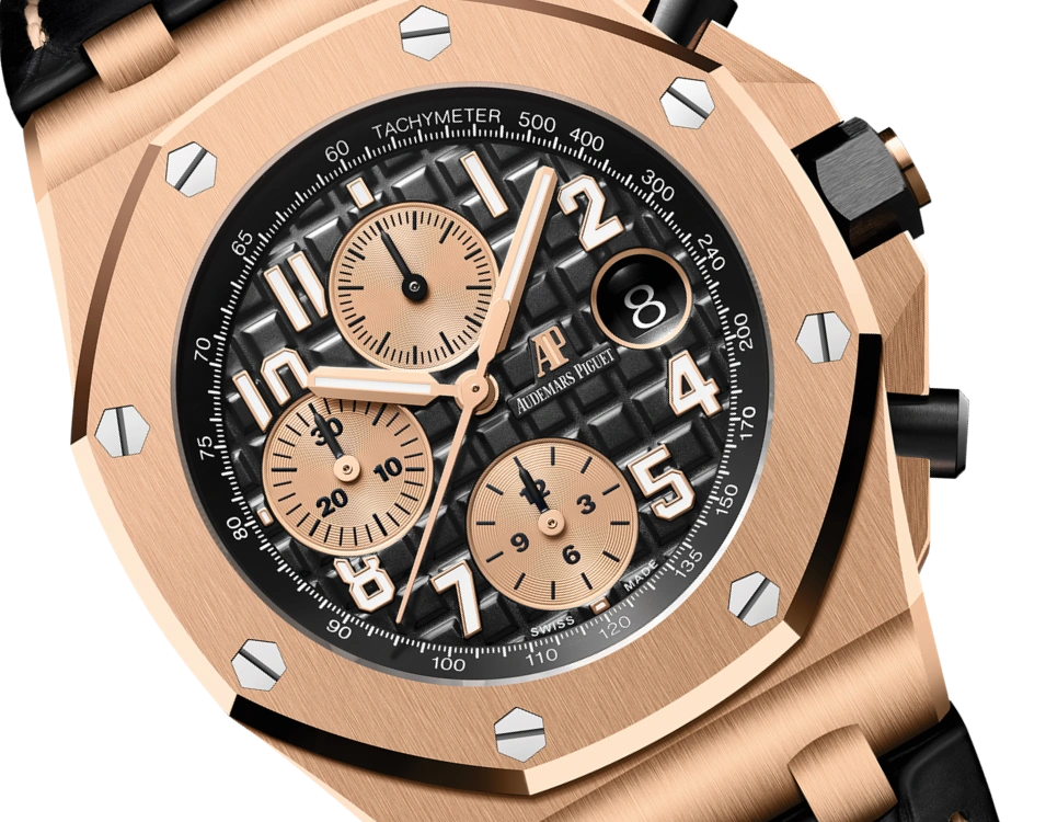 Black dial engraved with “M??ga Tapisserie” oversized check decoration, with rose gold sub-dials, rose gold applied hour-markers and Royal Oak hands with luminescent coating, black inner bezel.