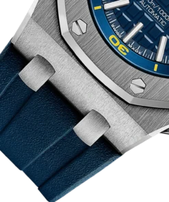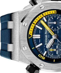A blue Royal Oak Offshore with a splash of yellow, boasting fresh design and fun features. Dive into fun with the new Royal Oak Offshore Diver Chronographs, characterized by daring new design elements. Blackened white gold hands and hour-markers stand out against bright, high-contrast and funky colors.