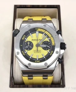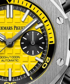Yellow dial with ??M??ga Tapisserie?? pattern, black counters, blackened gold applied hour-markers and Royal Oak hands with luminescent coating, black rotating inner bezel with diving scale and zone from 60 to 15 minutes in yellow.