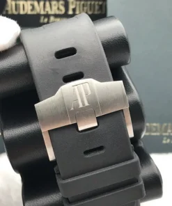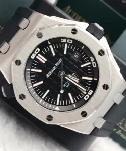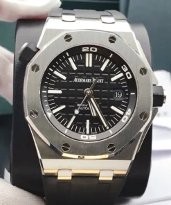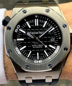 Black dial with ??M??ga Tapisserie?? pattern, white gold applied hour-markers and Royal Oak hands with luminescent coating (black minutes hand), black or silver-toned rotating inner bezel with diving scale and zone from 60 to 15 minutes in black.
