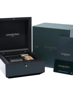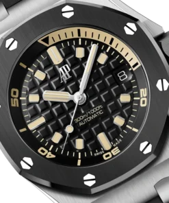 Black dial with ??M??ga Tapisserie?? pattern, pink gold applied hour-markers and Royal?Oak hands with luminescent coating, black rotating inner bezel. with zone from 60 to 15 minutes in beige.