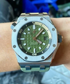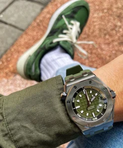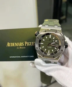 Army green dial with “M??ga Tapisserie” engraved oversized check, rose gold luminescent applied hour-markers and Royal Oak hands, black rotating inner bezel with beige 0 to 15 minutes zone