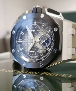 Smoked light brown dial with ??M??ga Tapisserie?? pattern, black counters and external zone, white gold applied hour-markers, white gold Royal?Oak hands with luminescent coating, black inner bezel