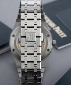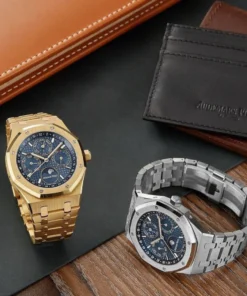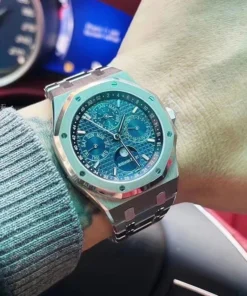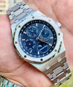 The Royal Oak Perpetual Calendar in stainless steel presents a dial offering contrasting blue tones. The subdials and inner bezel adorn the iconic ??Night Blue, Cloud 50?? hue of the original Royal Oak.