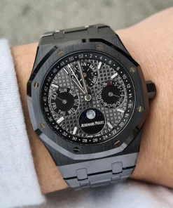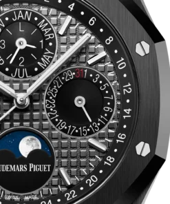 Crafted in hand-finished black ceramic, this Royal Oak Perpetual Calendar features day, date, month, astronomical moon, and week of the year. The leap year indication ?? pioneered by Audemars Piguet in 1955 ?? is also featured on the ??Grande Tapisserie?? decorated dial.