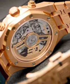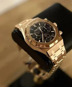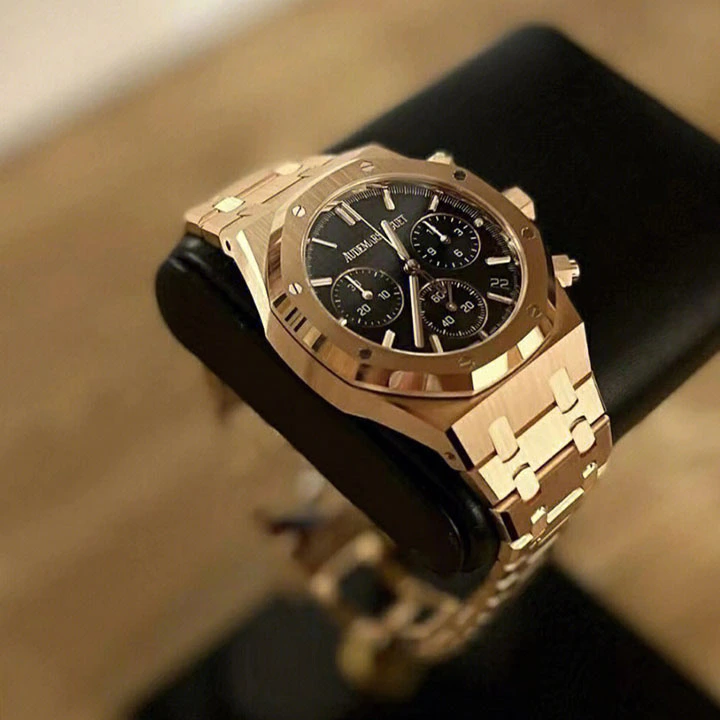 Black dial with ??Grande Tapisserie?? pattern, black counters, pink gold applied hour-markers and Royal?Oak hands with luminescent coating.